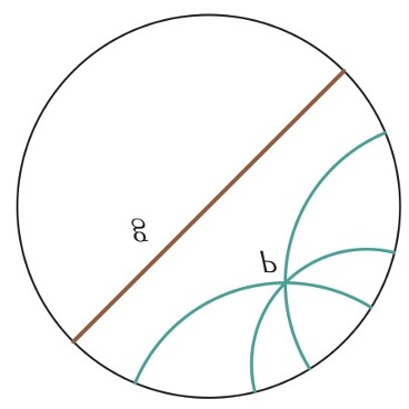 [Hyperbolic geometry: The geometry inside the disc where the notion of lines (geodesics or shortest distances) are either lines through the center or circles which are centered on the boundary of the disc.]
